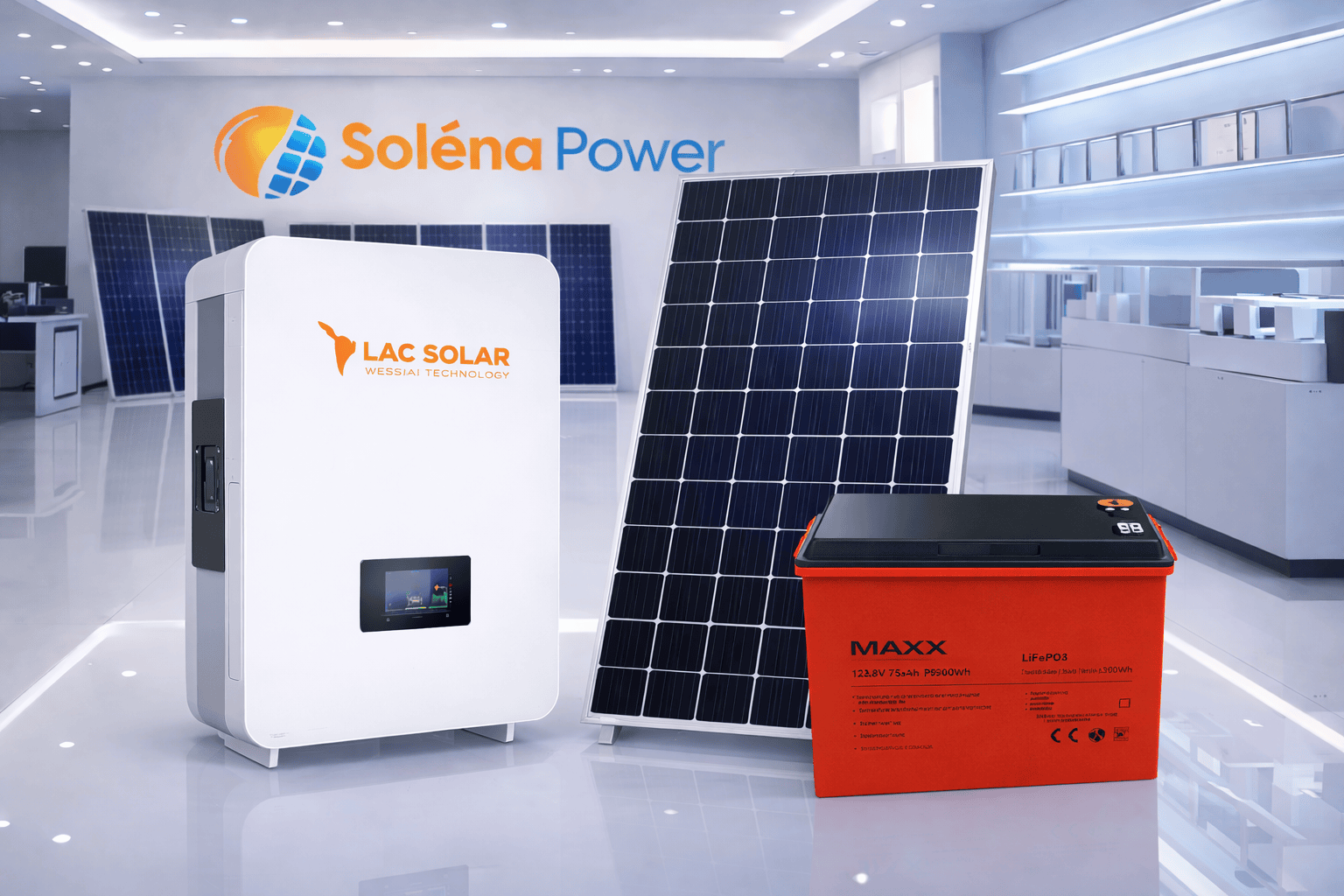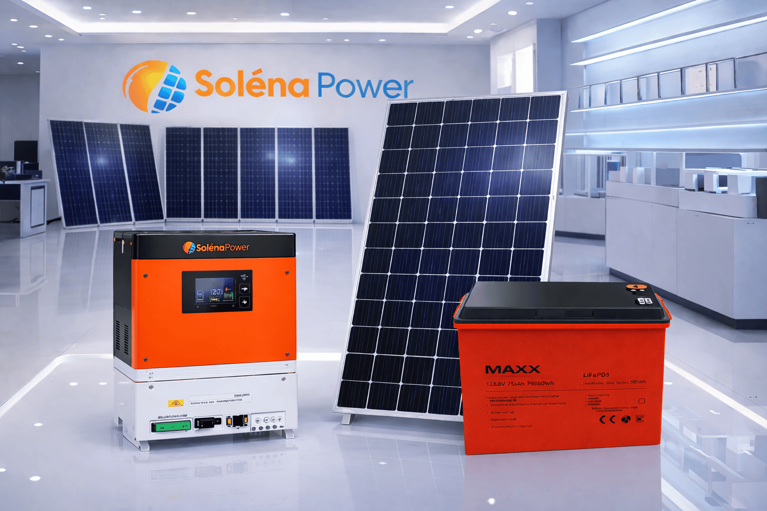 Este Kit Solar Avanzado de Solena Power está pensado para mayores consumos energéticos. Combina un inversor híbrido inteligente, un panel solar eficiente y una batería MAXX de larga duración